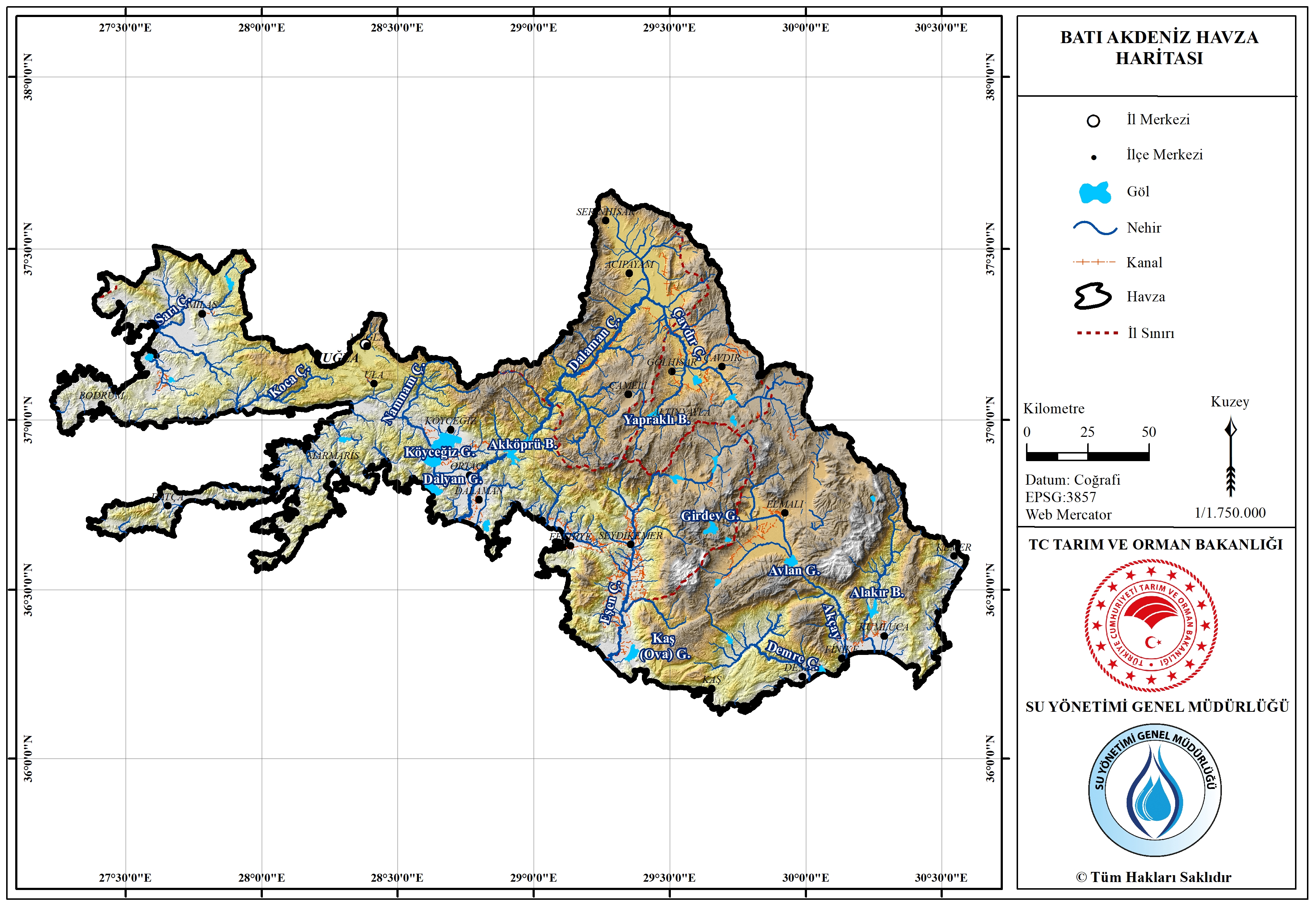 Türkiye yüzölçümünün yaklaşık %2,70'ini kapsayan Batı Akdeniz Havzası 21.032 km2 yağış alanına sahiptir. Batı Akdeniz Havzası, kuzeyden itibaren Laba Dağı, Beşparmak Dağı, Marçal Dağları, Sandıras Dağı, Bor Dağı, Honaz Dağı, Eşler Dağı, Çalbalı Dağı ve Tahtalı Dağ su bölüm çizgisiyle ve Datça Yarımadası'nın ucu olan Knidos'un doğusunda devam eden kıyı şeridiyle Akdeniz'le; Knidos'un kuzeyine doğru devam eden ve daha sonra doğuya yönelen kıyı şeridiyle de Ege Denizi ile sınırlanmıştır.